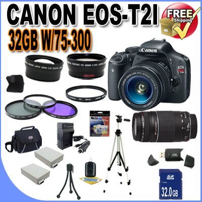 Save on Canon EOS Rebel In Stock. Best Deals Canon EOS Rebel T2i 18 MP CMOS APS-C Digital SLR Camera with 3.0-Inch LCD and EF-S 18-55mm f/3.5-5.6 IS Lens & Canon 75-300 Lens + 58mm 2x Telephoto lens + 58mm Wide Angle Lens (4 Lens Kit!!!!!!) W/32GB SDHC Memory+ 2 Extra Batteries + Charger + 3 Piece Filter Kit + UV Filter + Full Size Tripod + Case +Accessory Kit. Order Today with Free & Fast Shipping. Hot Savings!